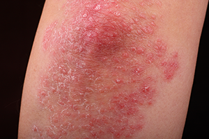 Psoriasis is a skin condition that creates red patches of skin with white, flaky scales. It most commonly occurs on the elbows, knees and trunk, but can appear anywhere on the body. The first episode usually strikes between the ages of 15 and 35. It is a chronic condition that will then cycle through flare-ups and remissions throughout the rest of the patient’s life. Psoriasis affects as many as 7.5 million people in the United States. About 20,000 children under age 10 have been diagnosed with psoriasis.